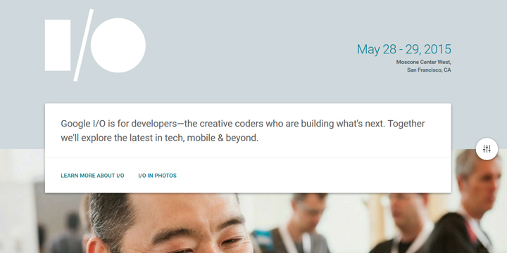 米グーグルが毎年開催している、開発者向けイベント「Google I/O」。その2015年版の公式サイトが公開されました。 今年は、5月28日から29日の2日間、米国サンフランシスコで開催し、その様子は例年通りライブストリーミングでも配信されます。 今日は、その公式サイトのデザインに注目していただきたいということで、お話をしたいと思います。 Google I/Oで発表されたデザイン・マニフェスト 昨年のGoogle I/O 2014での発表の中に、「マテリアルデザイン(英: Material Design)」というガイドラインの発表がありました。 マテリアルデザインとは、どんなプラットフォームやデバイスであっても統一感のある体験をユーザーにもたらすことができる、シンプルで明るく、クリアなデザ
