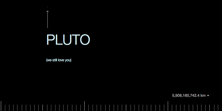 はたして、どのくらい遠いのでしょうか。ひとつ参考になるWebサイトを紹介したいと思います。ロサンゼルス在住のデザイナーであるジョシュさんが作成した1pixelmoon.comというWebサイトです。これは、月の大きさを1ピクセルとしたときに、太陽系の大きさはどのくらいなのか?ということを、ブラウザの横スクロールで表現したものです。とてつもなく長い横スクロールバーを移動していくと、途中には地球と月が。その先にずっと進んでいくと冥王星を発見することができます。