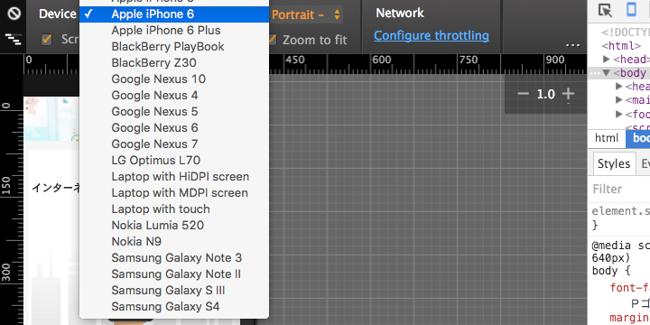 スマートフォンビューの上部に、デバイスを選択できるセレクトメニューがありますので、そちらからチェックしたデバイスを選択すると、そのデバイスサイズに画面が変更されます。