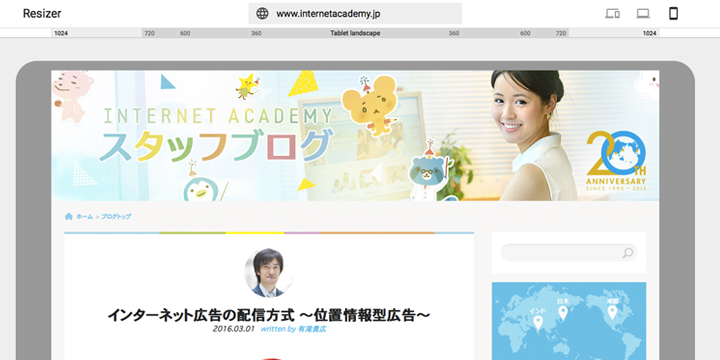 先日、Googleが「Resizer」というツールを発表しました。このツールは、スマートフォン、タブレット、デスクトップでのWebサイトの見え方をチェックできるツールです。それぞれのサイズで表示されたWebサイトが、実際にブラウザで表示されているかのようにスクロールをしたり、クリックをしたりすることができるので、レスポンシブWebデザインサイトのチェック時に、どのような挙動をするかのチェックをするのに最適ですね。