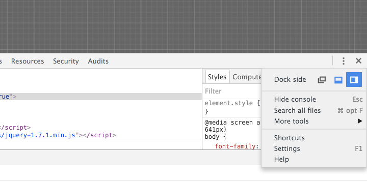 開発者ツールが上下区切りで表示されるとスマートフォンビューが小さく表示されてしまうので、左右区切りの表示ひ切り替えてみましょう。切り替えは、開発者ツール右側の縦にドットが3つ並んだアイコンから変更できます。