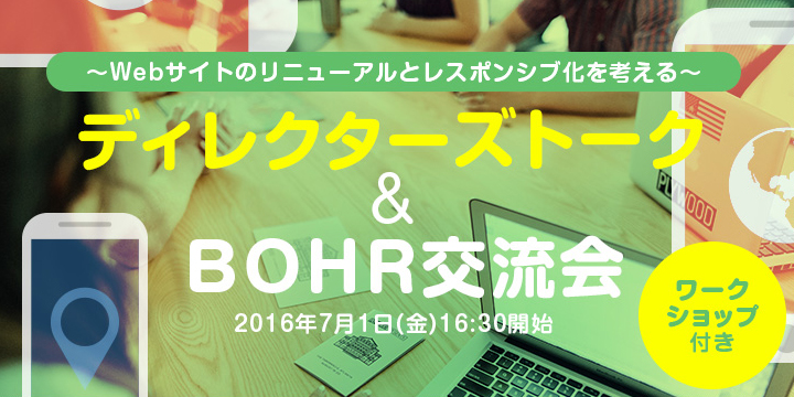 7/1(金)に、BOHRのイベントとして、「Webサイトのリニューアルとレスポンシブ化を考える!ディレクターズトーク & BOHR交流会」を開催します! 本イベントは、制作会社の現役Webディレクターから、Webサイトのレスポンシブ化についてノウハウを聞くことができるセミナーと、インストラクターや受講生・卒業生と語り合える交流会がセットのイベントになっています。 イベントの見どころ Webサイトのスマートフォン対応は、SEOにおいてもユーザー数においても、年々重要度が増してきています。 だからこそ、突然「今使っているサイトをスマホで表示できるように、レスポンシブ化したい!」という依頼が舞い込むことも日常茶飯事です。 そんな時、どのようにプロジェクトを進めていけば良いのか、実際に制作