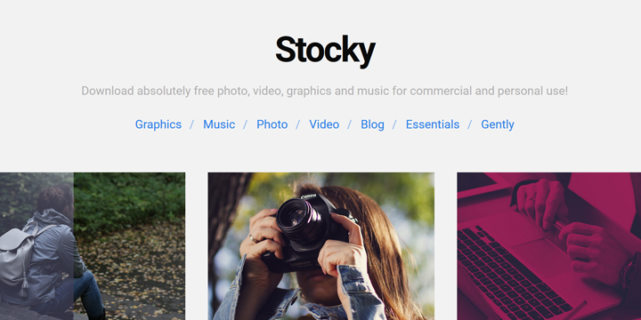 コンテンツマーケティングやSNSマーケティングが盛んになっている昨今、商用利用OKのフリー素材サイトは本当に重宝しますよね。 特に、高品質なものがそろっていれば何よりですが、最近は取り扱いのある素材のバリエーションも、イラストや写真に限らなくなってきました。 今日紹介する「Stocky」もまさにそうで、商用利用OKな写真、グラフィック素材、動画、そして音源まで、高品質なフリー素材がそろっています! 「Stocky」の使い方 使い方はとーーーってもシンプル。 「Graphics」「Music」「Photo」「Video」「Blog」の5つのカテゴリに分かれているので、ほしい素材のタイプに応じて選択すると、素材の一覧が表示されます。 その中から興味がある素材をクリックすると詳細ページが表示され