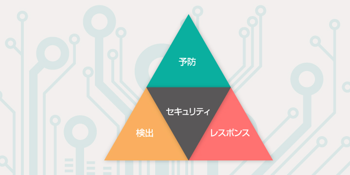 皆さん、こんにちは。 本日もセキュリティ対策の概念の続きです。 今回はセキュリティ対策を実施するにあたり、 「セキュリティの三位一体」と呼ばれる3つの行動指針を見ていきましょう。 予防 予防とは、パソコンやネットワークの脆弱性(サイバー攻撃される危険性)を、 あらかじめパッチ(修正プログラム)でふさいでおき、外敵が侵入しないようにしておくことです。 セキュリティの枠組み構築の際には、予防の観点が最も大切になります。 侵入が起こってからの検出やレスポンスよりも、機密漏洩を防ぐ方がより効率的で、 費用対効果も高いからです。 脆弱性をすべてなくすことはできなくても、攻撃されにくい体制をとっていれば、 攻撃者はもっと攻撃しやすい対象に向かいます。 検出 検出とは、予防策の実施後、予防策が機能しなか