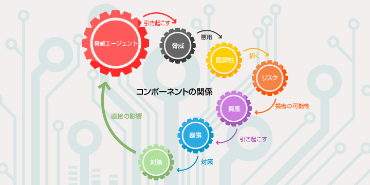 皆さん、こんにちは。 今回はセキュリティ対策の全体の流れを理解するために、 コンポーネントの考え方を学びましょう。 コンポーネントとは? コンポーネント (Component)とは、英語で「部品」「成分」「構成要素」などの意味です。 ITの分野でコンポーネントというときは、通常はソフトウェアやシステム、機器を構成する部品や要素を意味します。 しかし今回、情報セキュリティの分野において論じる際の「コンポーネント」とは、 リスクがどのように発生し、それが企業にどのように影響を与えるのかを示す「構成要素」という意味合いだとご理解ください。 サイバー攻撃によるリスク発生 悪意あるサイバー攻撃によって不正なアクセスや損害を与えようとする者を「脅威エージェント」と呼びます。 脅威エージェントは、組織や