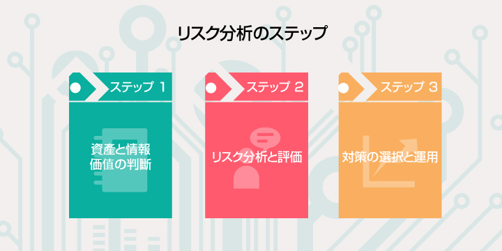 皆さん、こんにちは。 今回は会社や組織の情報資産を守るためのリスク分析という考え方をご紹介いたします。 情報リスクマネジメントとリスク分析 悪意ある攻撃者から会社や組織の情報資産を守るためには、情報リスクマネジメントを行う必要があります。 情報リスクマネジメントとは、企業や組織が情報資産を守り、適切に管理・運用するために、 一定の方針や規定のもとに「機密性・整合性・可用性」をバランスよく維持管理することです。 情報リスクマネジメントの最初の段階として、まずリスク分析を行います。 リスク分析とは、脆弱性や脅威を特定し、セキュリティの保護手段を講じるため 、考えられる損害を評価することです。以下、具体的にリスク分析について考えてみましょう。 リスク分析のステップ リスク分析は通常、3つのステッ