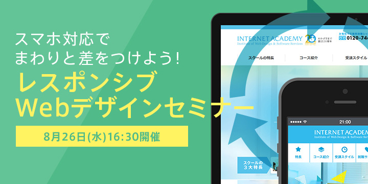 インターネット・アカデミーは、8月26日(水)に「スマホ対応でまわりと差をつけよう!レスポンシブWebデザインセミナー」を開催します! このセミナーでは、Webサイトのスマホ対応ってどうしたらいいの?という方を対象に、そのデザイン手法である「レスポンシブWebデザイン」をご紹介致します。 本セミナーの見どころ ユーザーがどんどん増えているスマートフォンやタブレット端末。 それらに対応するレスポンシブなWebサイトを作るにはどうすればいいのか、基礎からご紹介致します。 レスポンシブ対応は、決して一過性の流行のものではなく、今後Webデザイナーやクリエイターにとって、必携のスキルとなるものです。 本セミナーでは簡単な実技演習も内容に含まれているので、これからのWebサイト制作に活かしたいという