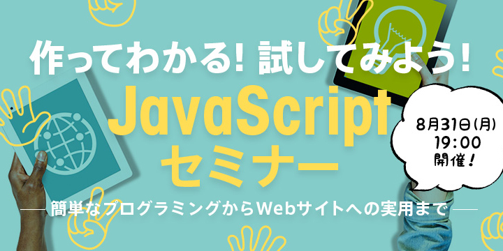 インターネット・アカデミーは、8月31日(月)に「作ってわかる!試してみよう!JavaScriptセミナー ~簡単なプログラミングからWebサイトへの実用まで~」を開催します! このセミナーでは、JavaScriptに興味があるという方を対象に、そのプログラムの考え方からWebサイトにスライドショーの組み込みを行うという実践的な内容までご紹介致します。 本セミナーの見どころ まだ学び始めたばかりで、JavaScriptがどういうものなのかよく分かっていない、という方。 とにかく、JavaScriptに苦手意識があるという方などにオススメの内容です。 本セミナーでは、じゃんけんゲームを作成するという簡単なプログラムの実技演習も内容に含まれていて、文法から再確認をすることができます。 さらに、