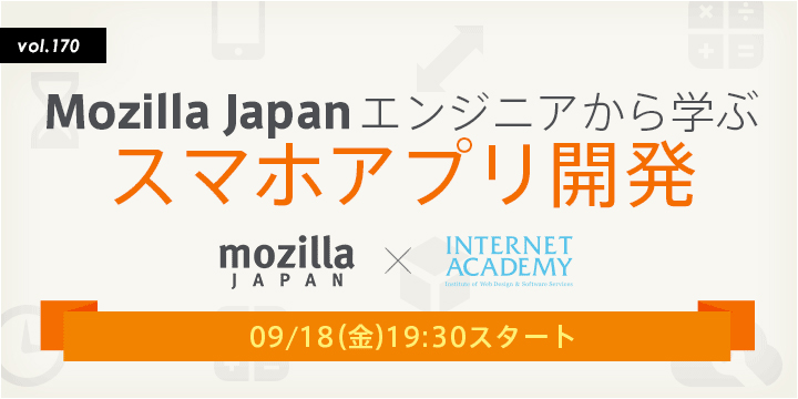 インターネット・アカデミーでは、9月18日(金)に「Mozilla Japanエンジニアから学ぶスマホアプリ開発」セミナーを実施します! 今回のセミナーでは、Firefoxブラウザをはじめとした数々のオープンソース製品を開発・提供しているMozilla Japanの清水智公氏をお招きし、HTML5で作るスマホアプリ開発のノウハウについてお話しいただきます。 しかも!通常はインターネット・アカデミーの受講生・卒業生しか参加できないイベントなのですが、先着10名でこれから入校をご検討いただいている方にもご参加いただけます! 今回のセミナーの内容 今回のセミナーでは、HTML、CSS、JavaScriptの基礎を学ばれた方(ホームページ講座を受講済みレベル)、知識がある方に向けて、HTMLやCS