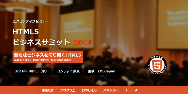 「HTML5プロフェッショナル認定試験」を運営しているLPI-JAPANが、3月9日にエグゼクティブセミナーを開催します。 イベント名は、「エグゼクティブセミナー HTML5 ビジネスサミット2016 ~新たなビジネスを切り開くHTML5~「基幹系システム開発における活用事例」」。 今、HTML5はWebサイト制作だけでなく、OSに左右されないマルチデバイス対応言語としての特性を活かし、基幹システムにおいても注目を浴びています。 セミナーでは、そんなHTMl5を活用して成功している企業の方々が登場してお話やノウハウを聞くことができるそうです。 "HTML5を今学んでおけば、Webサイト制作はもちろん、システム開発や新規ビジネスの発起など、幅広い場面で活用できる"...ということを知る良いき