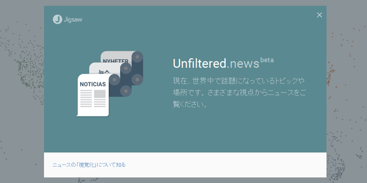 こんなニュースサイトは今までになかった!ビジネスにも使える!というサイトを本日はご紹介します。 連日、何万社ものニュースメディアが世界中でニュースを発信していますが、同じトピックスが必ずしも各国で同じだけの重要度として報道されるわけではありません。 今日紹介する「Unfiltered.news」では、そんな風に世界で話題になっているにも関わらず、自分が住んでる地域では"注目度が低い"ニュースが視覚的に理解できるサービスです。 Unfiltered.news の使いかた サイトにアクセスをすると、国別に円形表示された世界地図が表示されます。 円の中には、特定の地域のニュースで言及されたニューストピックスがキーワードとして表示されています。キーワードのフォントサイズは、言及された回数によって大