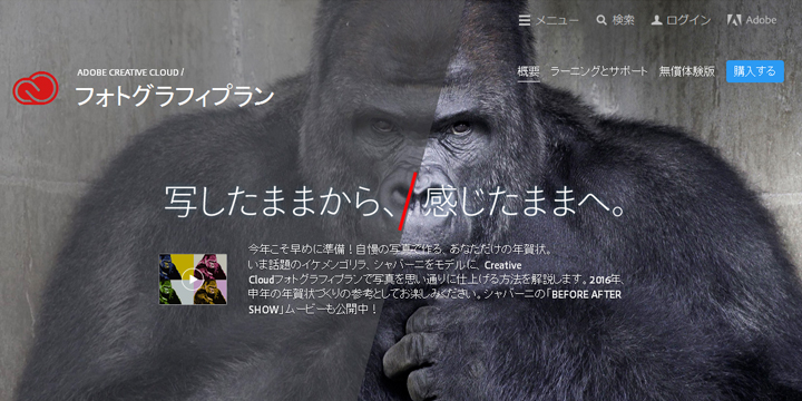 Adobeがゴリラ界?屈指のイケメン、東山動物園のシャバーニ君と契約を結び、「イケメン年賀状キャンペーン」を実施しています。 2016年の干支は申(さる)。 そろそろ年賀状も作らなければならない時期になってきました。 Adobeのこのキャンペーンでは、シャバーニ君のイケメン写真をダウンロードできるばかりではなく、その加工方法まで紹介されています。 元のイケメンが、PhotoshopやLightroomを使ってよりイケメンに!! その加工のテクニックも大変勉強になります。 個人的なおすすめは「イケメンゴリラ フォント」。 なんと、シャバーニ君のイケメンさをデザインに活用したフォントが提供されているのです! こんなに当ブログで「イケメン」と連呼することは今までもこれからもないでしょう(笑) で
