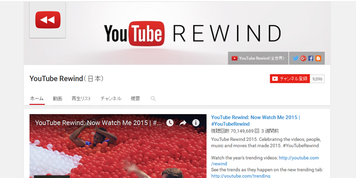 今日はいよいよ大晦日ですね。 皆さまにとって、2015年はどんな一年でしたでしょうか? 新しい気持ちで新年を迎えるためにも、自分のことを振り返って考えることは、とても大事なことですね。 ちなみに、大晦日と言えば、NHKの紅白歌合戦ですが。 それ以外にもう一つ、今年一年間を振り返る上で、「YouTube Rewind」チャンネルを見るのもオススメです。 YouTube Rewind は、動画共有サービスYouTube で注目を集めた動画、人、イベントを振り返るチャンネル。 音楽はもちろん、動物や映画など注目を集めたYouTube 動画で、今年一年の流行をおさらいすることができます。 特に、2015年に世界中で注目を集めたYouTuber(ユーチューバー:自作した動画を公開し、その広告収入で生
