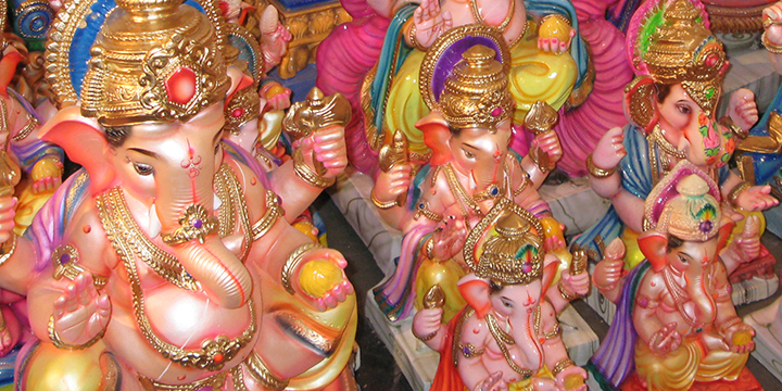 半月ほど前の話題になってしまいますがインドの話を一つ。 9月17日(木)。 この日はヒンドゥー教の祭日の一つ、Ganesh Chaturthi(ガネーシャ・チャトゥルティ)でした。 宗教上の慣わしが日常生活に深く浸透しているインドでは、祭日は家族や地域ぐるみで、その対象をお祝いしたり、幸福や繁栄をお祈りする、とても神聖な一日になります。 ガネーシャ・チャトゥルティは、ヒンドゥー教の有名な神様「ガネーシャ」の誕生日をお祝いする祭日で、この日も大いに街はお祭りムードで盛り上がっていました。 象の頭を持つガネーシャ像を見たことがある方は日本でも結構いらっしゃるのではないでしょうか。 ガネーシャは、ヒンドゥー教の神様「パールヴァティー」が、自らの身体の汚れから集めて作った人形に命を吹き込んで生まれ