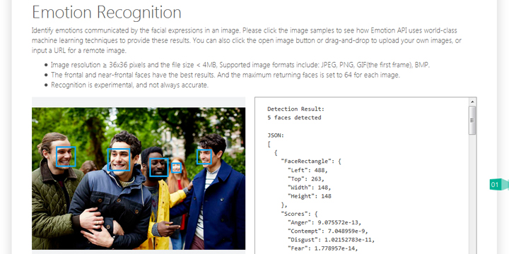 Microsoftの人工知能(AI)開発チーム「Project Oxford」が、人の表情から感情を読み取る技術を開発しました。 イギリスで11月11日に行われたイベント「Future Decoded 2015」にて披露があり、すでにそのツールはオンライン上でも「Emotion Demo」として発表され、私たちも使用することができます。 デモツールにアクセスをすると、左側に写真の表示スペースがあります。 人物の表情に青い枠が表示されているので、マウスオーバーしてみてください。 すると、その表情に対し、Anger(怒り)・Contempt(軽蔑)・Disgust(不愉快)・Fear(恐れ)・Happiness(幸福)・Neutral(無関心)・Sadness(悲しみ)・Surprise(驚き