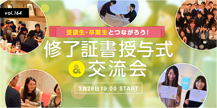 インターネット・アカデミーでは、3月28日(土)に「受講生・卒業生とつながろう!修了証書授与式&交流会」を実施します!(※ご参加いただけるのは、インターネット・アカデミーの受講生と卒業生が対象です。) 今回のイベントは、インターネット・アカデミーの受講コースの全授業を受け終えた方々を対象にした修了証書の授与式と、受講生同士の交流会がセットで行われます♪ 前回開催した交流会の様子 前回は2月に交流会を開催したのですが、そのときの参加者の皆様から「卒業生の方々からWeb業界に入るまでの勉強の仕方や転職活動の進め方のアドバイスが聞けてよかった!」や、「仲間が作れてとても良かった」といった感想をいただくことができました。 その時の様子はFacebookで写真を公開していますので、ぜひぜひご覧くださ