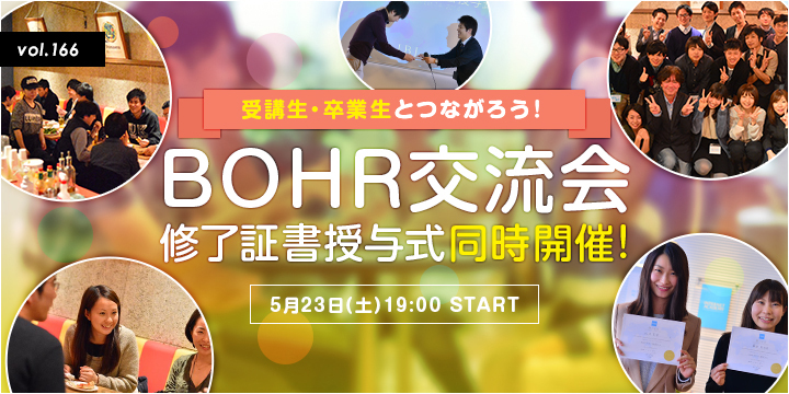 インターネット・アカデミーでは、5月23日(土)に「受講生・卒業生とつながろう!BOHR交流会」を実施します!(※ご参加いただけるのは、インターネット・アカデミーの受講生と卒業生が対象です。)    今回のイベントは、インターネット・アカデミーの受講コースの全授業を受け終えた方々を対象にした修了証書の授与式と、受講生同士の交流会がセットで行われます♪ 前回開催した交流会の様子 前回は3月に交流会を開催しました。 参加した卒業生からは、スクールの活用法や人脈の大切さなど、いろいろなことをアドバイスして頂きました。 社会人になってしまうと、なかなか新しい友人を作ったり、仲間を作る機会が減ってしまうものです。 でも、BOHRのイベントにご参加いただければ、年齢層も職業経験もさまざまな方と仲良くな