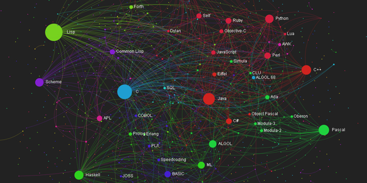 実は、たくさんあるプログラム言語は、全く別のものという訳ではなく、それぞれに関係性があります。 何故なら、何かの言語から新しい言語が生まれたり、それを進化させてさらに新しい言語が生まれる。 そういう進化を繰り返しているためです。 たとえば、Webページを作成するために必要な言語、HTMLは、SGML(Standard Generalized Markup Language)という言語から生まれました。SGMLは、電子出版物や大量に及ぶ文書を効率的に活用するために生まれた言語です。 そういった言語の関係性を視覚的に知ることができるのが、「Programming Language Influence Network」です。 指定した言語がどの言語から影響を受けて作られたか、また他の言語にどう影