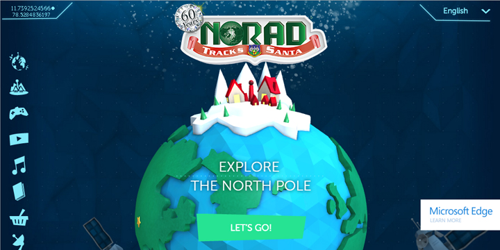 サンタを追跡するWebサイトが、今年は2つも公開されました。 まず1つ目が、米コロラド州にある北アメリカ航空宇宙防衛司令部(NORAD)が毎年公開している「NORAD Tracks Santa(サンタ追跡サイト)」です。 このサイトでは、クリスマスまでの間、インターネットゲームやクリスマスソングの視聴を楽しんだり、過去のサンタ追跡に関する動画などを見たりすることができます。 12月24日の午前00時01分(MST 山岳部標準時)を過ぎると、なんとサンタクロースが飛行準備をしている様子やその後世界を飛び回る様子がストリーミング公開されるとか。 言語は8か国語に対応しているので、有難いことに日本語でも閲覧できます。 2つ目に紹介したいのが、今年初めて公開された「Google サンタを追いかけよ