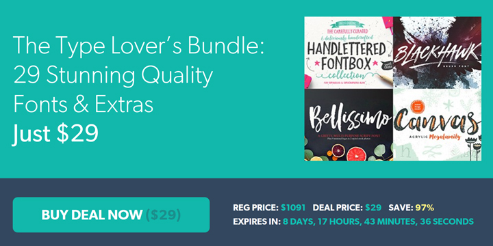 Webデザインにおいて重要な要素の1つが、フォントです。特に、今Webデザインのトレンドになっているフラットデザインにおいて、フォントはとても重要視されているので、どれだけ良いフォント素材を持っているかでデザインの幅が大きく変わります。 とはいえ、フリー素材、つまり無料のフォントばかりの中からイメージに合うものを探すのはとっても大変ですよね。 そこで、今日は、今期間限定でディスカウント中の有料フォント素材「 The Type Lover's Bundle 」をご紹介します。 このフォントセットの魅力は、なんといっても、「商用利用OK」+「すべてのフォントでWebフォントが用意されている」ところにあります。しかも、その数190種類! それが、いまだけたったの$29(約3,000円)で購入でき