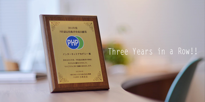 インターネット・アカデミーは、「第三回 PHP認定技術者育成貢献賞」を受賞しました。 この賞は、日本国内におけるPHP技術者の育成と質の向上を目的に活動しているPHP技術者認定機構が定めるものです。 インターネット・アカデミーは、同機構が定める認定スクールの第一号として、数々の技術者育成に向けた活動を行ってきました。 なんと、今回で3年連続での受賞となります! うれしいです! PHP技術者認定機構が運営するPHP技術者認定試験は、ITスキル標準(ITSS)に登録を受け(詳しくは過去のブログ記事「今資格を取るならITスキル標準に登録された「PHP技術者認定試験」!」をご覧ください)、今Web・IT業界への就職・転職をお考えの方にとっても、仕事に活かすためにスキルアップをお考えの方にとっても、