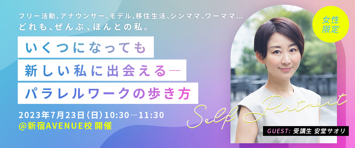 今回のイベントは、「【Self Portrait vol.1】 いくつになっても新しい私に出会える―パラレルワークの歩き方」と題し、ゲストに受講生の安堂サオリさんをお迎えするトークイベントです。