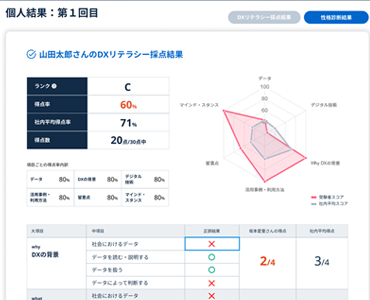他社の平均スコアと比較できるのも特徴で、人事担当者が受講者を評価したり、社内でレポートする際にもご利用いただけます。