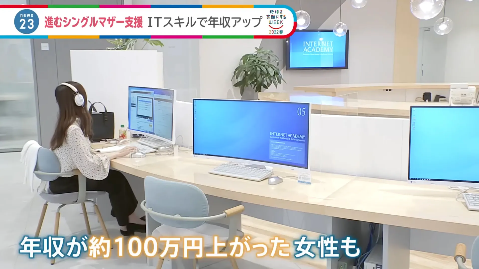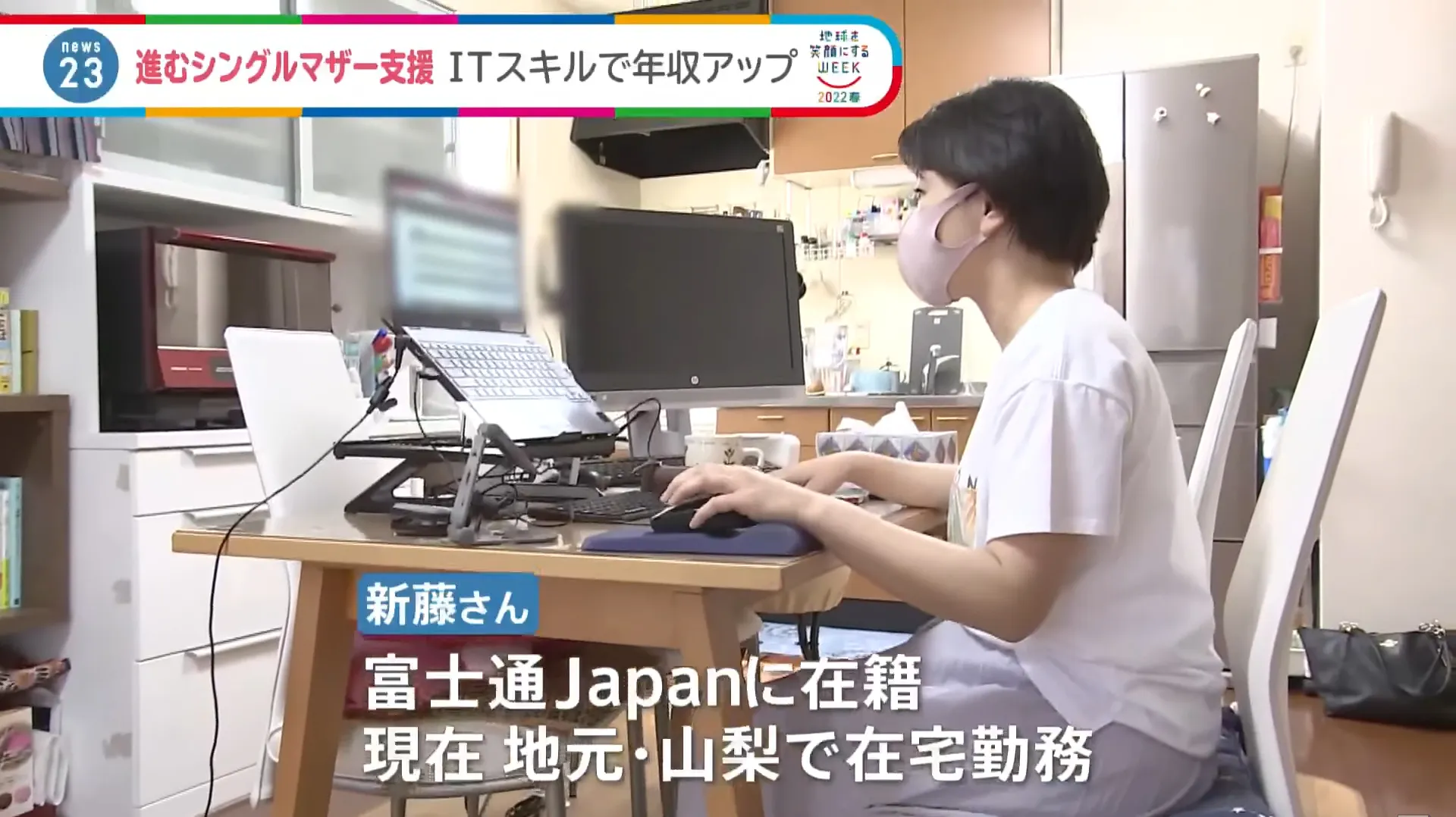 TBSテレビの報道番組「news23」のSDGs特集で、シングルマザー向けのスキルアップ支援事業が紹介されました。学んだWeb・ITスキルを活かしてキャリアアップし、生活が変わったというシングルマザーの卒業生にもご出演いただきました。キャリアを考え直したいママさんや、シングルマザーとして収入アップを目指したい方は、ぜひご相談ください。